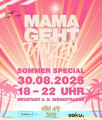 Am Samstag, 30.08.2025, ist die Wiederholung von unserer Special SOMMER OPEN AIR MAMAGEHTTANZEN Party in Neustadt a. d. Weinstraße im Soku ( Winzinger Str. 10, 67433 Neustadt an der Weinstraße